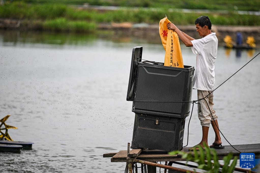 9月8日,村民在海南省文昌市文教镇加美村养殖塘用投食机给鱼儿喂食。