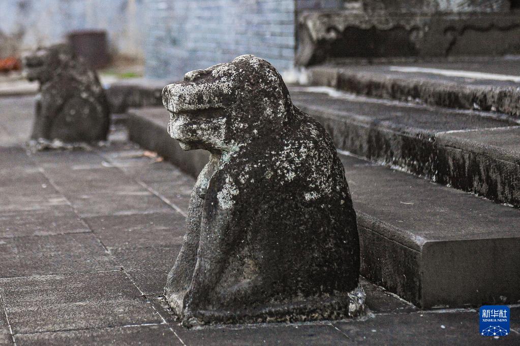 这是海南省文昌市文教镇加美村邢宥故居门前的一对石狮(9月4日摄)。因年代久远,石狮已大片斑驳。