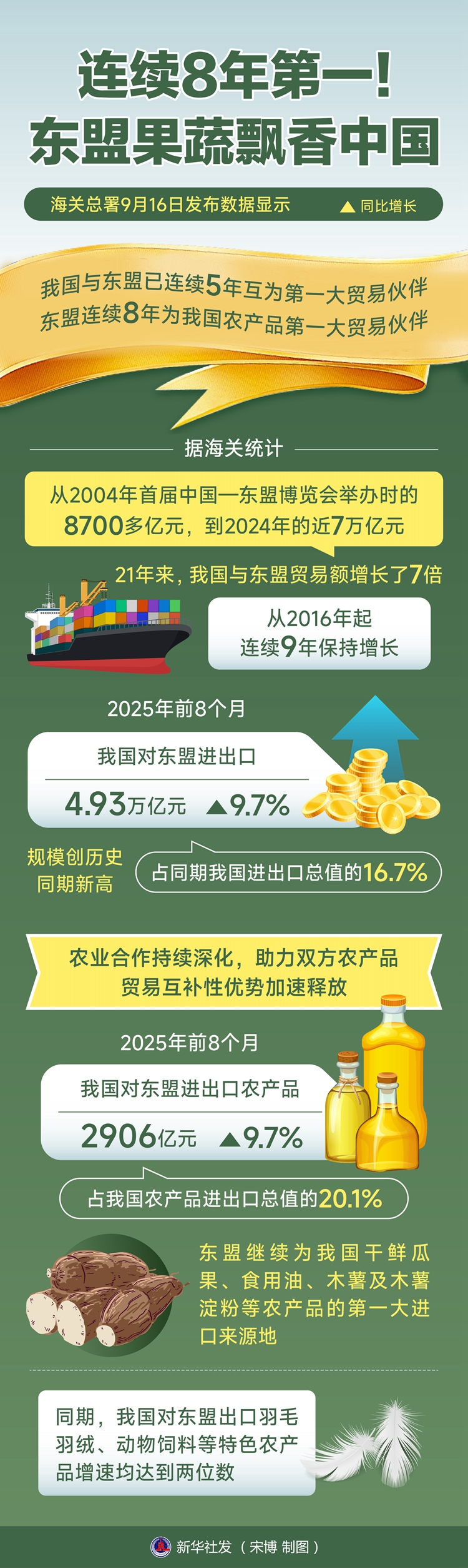 新华社北京9月16日电(记者邹多为)海关总署16日发布数据显示,我国与东盟已连续5年互为第一大贸易伙伴,东盟连续8年为我国农产品第一大贸易伙伴。
