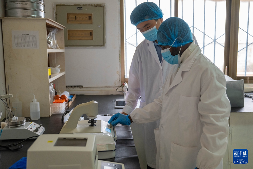 9月10日,在刚果(布)西部布恩扎省卢迪马镇生生农业科技有限公司,中方和当地技术人员一起检测木薯粉。 新华社记者 郑扬子 摄