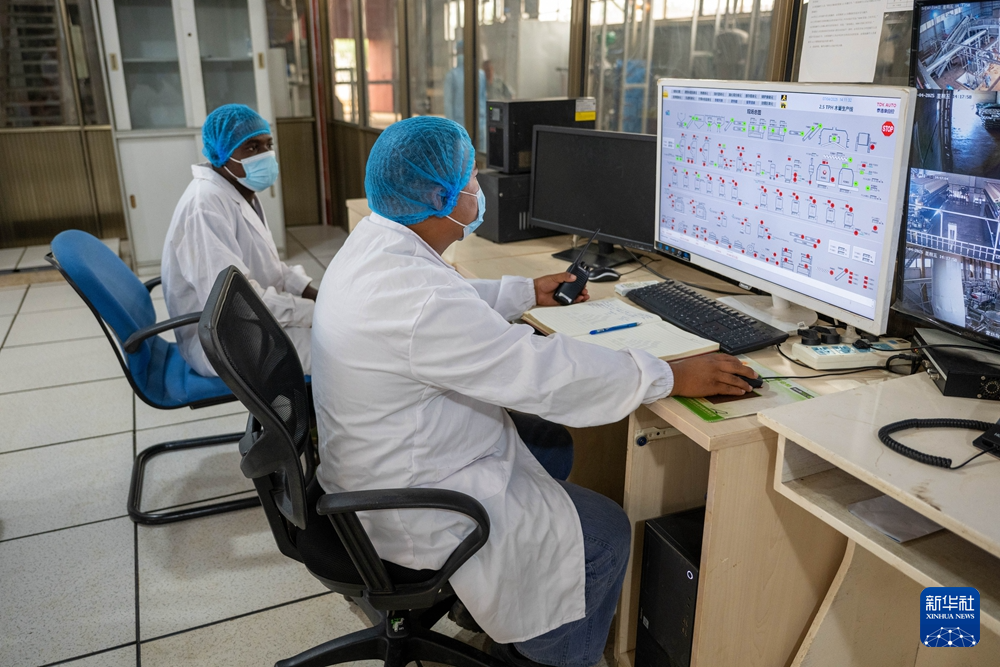 9月10日,在刚果(布)西部布恩扎省卢迪马镇生生农业科技有限公司,工作人员在监测流水线作业情况。 新华社记者 郑扬子 摄