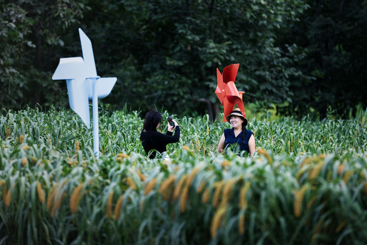 游客在武安市“山里冀·李家庄山游市集”的谷子品种示范基地打卡拍照。(李树锋 摄)