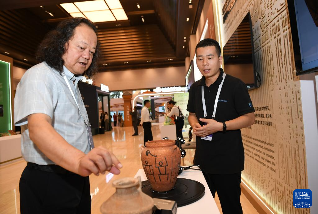 9月17日,与会嘉宾在论坛的文化遗产数字化精品项目展上了解思看科技高精度激光三维扫描技术。新华社记者 李一博 摄