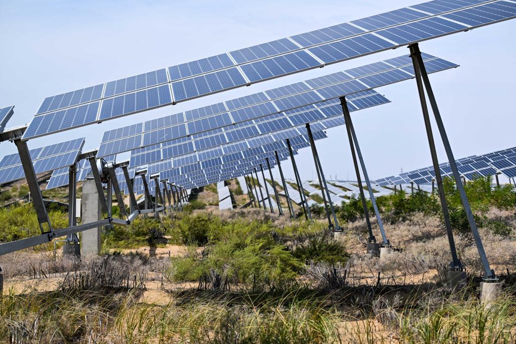 这是9月10日拍摄的位于库布其沙漠的达拉特旗光伏基地,光伏板下生长着沙生植物。新华社记者 李志鹏 摄