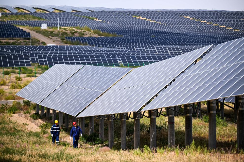9月10日,工人在位于库布其沙漠的达拉特旗光伏基地巡检。新华社记者 李志鹏 摄