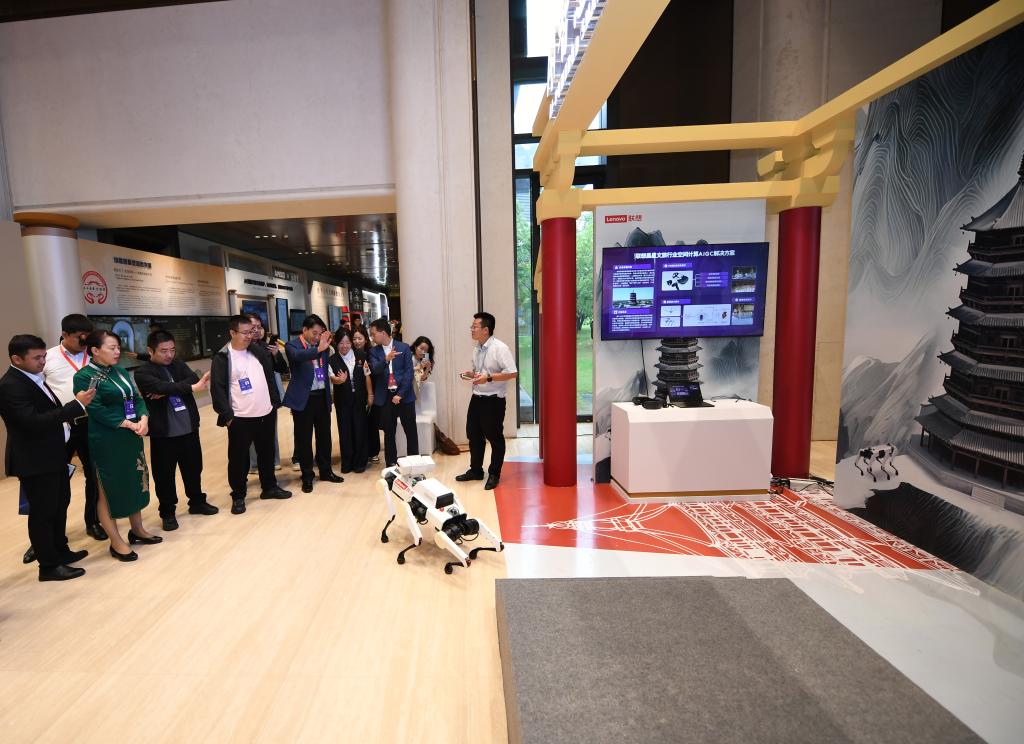 9月17日,与会嘉宾在现场了解AI智慧应县木塔数字化保护项目。新华社记者 李一博 摄