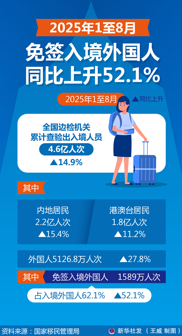 新华社北京9月18日电(记者任沁沁)记者18日从国家移民管理局获悉,2025年1至8月,全国边检机关累计查验出入境人员4.6亿人次,同比上升14.9%;其中内地居民2.2亿人次、港澳台居民1.8亿人次,同比分别上升15.4%、11.2%;外国人5126.8万人次、同比上升27.8%,其中免签入境外国人1589万人次,占入境外国人62.1%,同比上升52.1%。