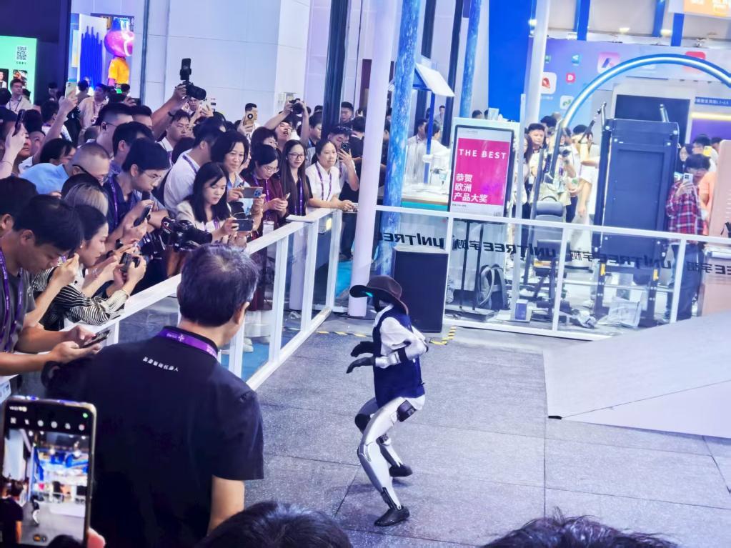 在东博会宇树科技展位,机器人在表演热舞。新华社记者王楚然 摄