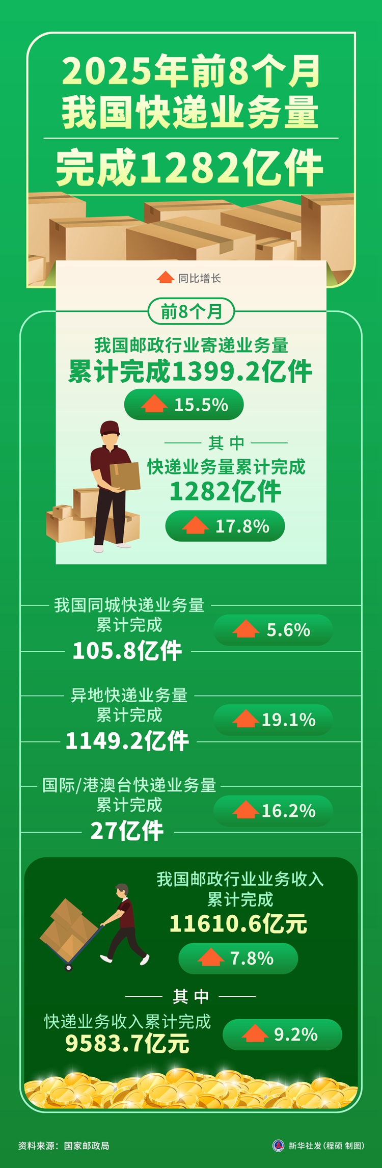 新华社北京9月18日电(记者 叶昊鸣)记者18日从国家邮政局获悉,前8个月,我国邮政行业寄递业务量累计完成1399.2亿件,同比增长15.5%。其中,快递业务量累计完成1282亿件,同比增长17.8%。
