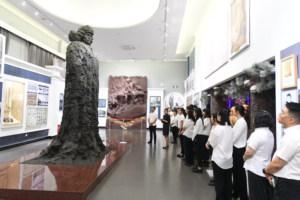 2025年7月7日,参观者在哈尔滨市东北烈士纪念馆参观展现杨靖宇形象的雕塑作品《脊梁》。