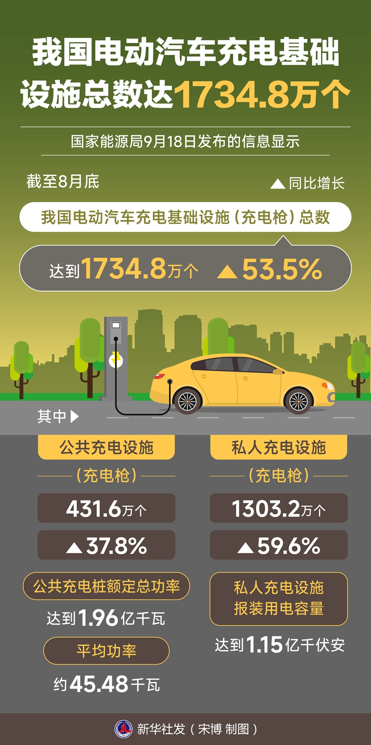 新华社北京9月18日电(记者王悦阳)国家能源局18日发布的信息显示,截至8月底,我国电动汽车充电基础设施(充电枪)总数达到1734.8万个,同比增长53.5%。