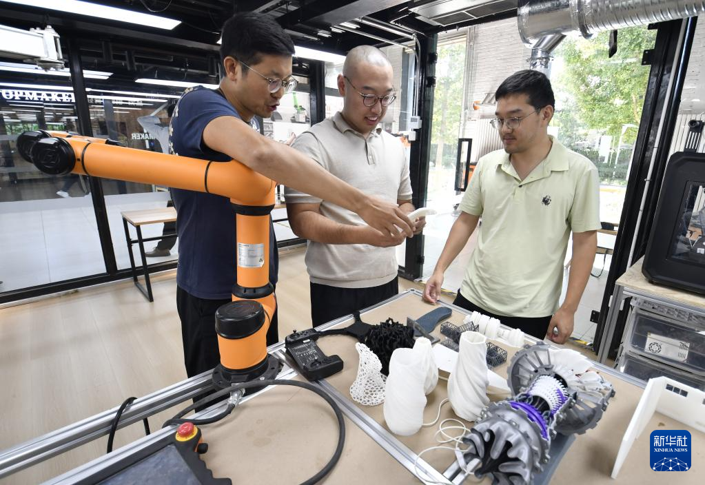 青年创业者在纪家庙双创产业园内的创意实践“梦工场”使用3D打印机(9月19日摄)。