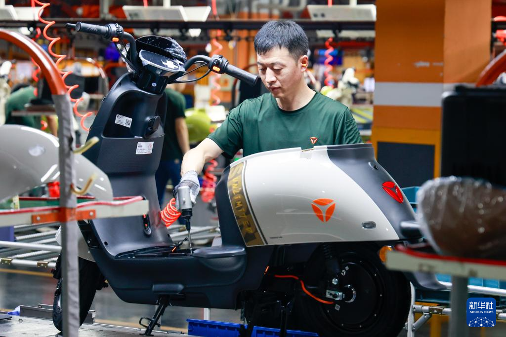 9月16日,在江苏无锡锡山区电动车产业园,工作人员在雅迪科技集团有限公司的电动车生产线上紧固安装脚踏板。新华社记者 刘佳琪 摄