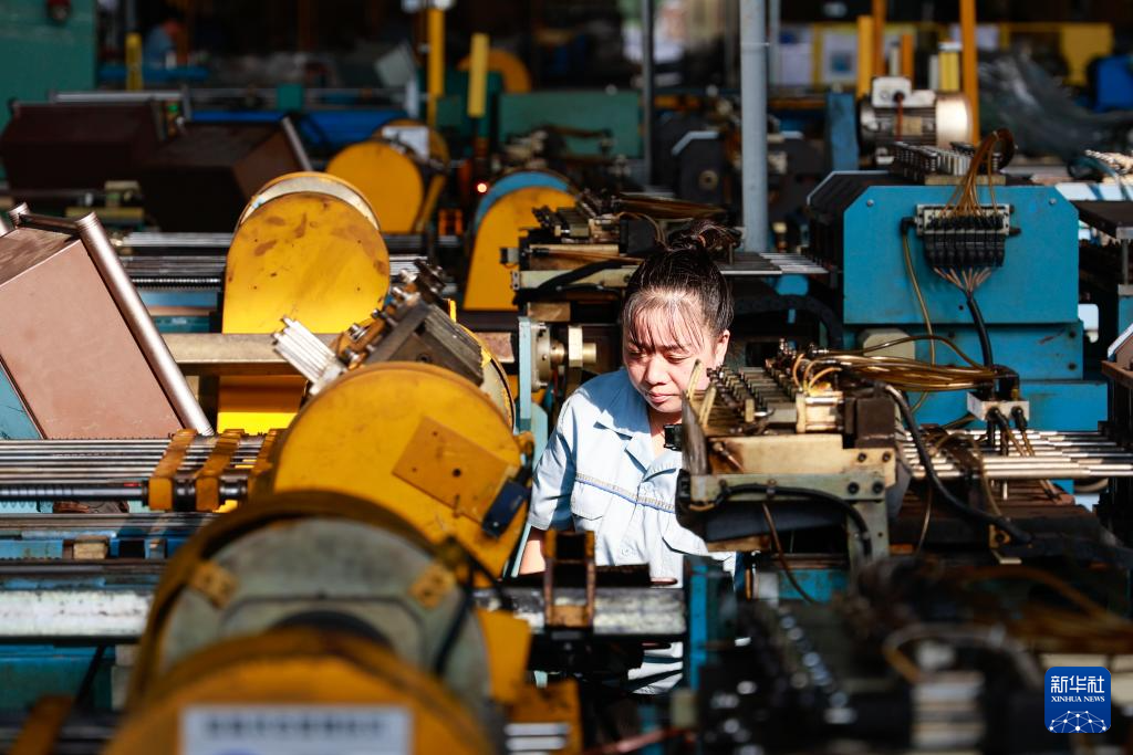 9月17日,在江苏常州友奥智能科技股份有限公司,工作人员在生产车间操作弯管机。新华社记者 刘佳琪 摄