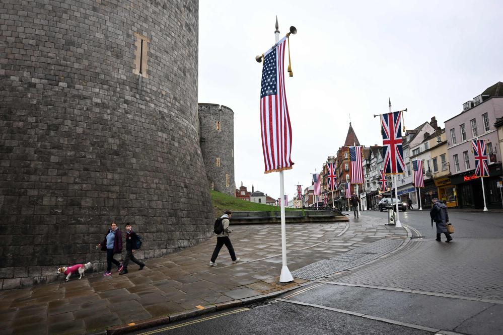 这是9月17日在英国伦敦近郊的温莎城堡外拍摄的美国国旗和英国国旗。新华社/法新