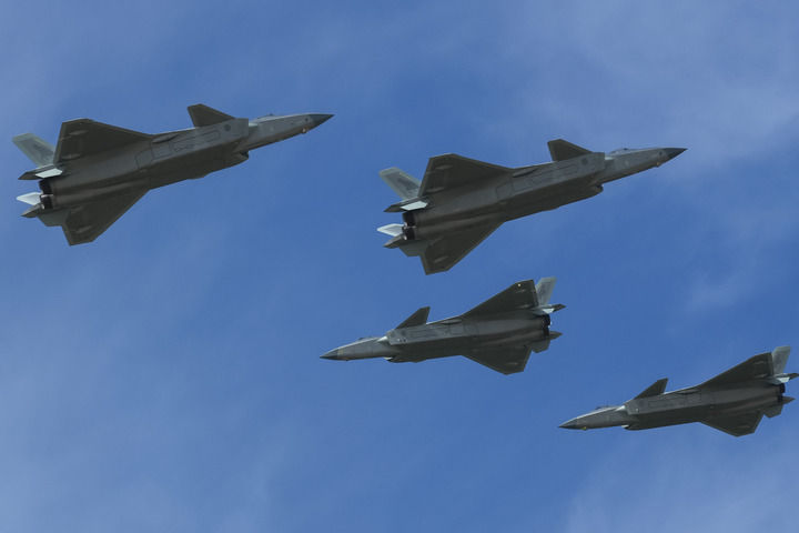 ↑9月19日,歼-20进行四机编队机动飞行展示。新华社记者 许畅 摄