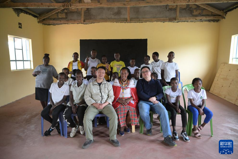 8月31日,在肯尼亚西南部纳罗克郡西纳罗克区艾通镇的女童救助中心新建的教室内,救助中心出资人汤麟(前排左三)、救助中心负责人玛丽·西兰托伊(前排中)和袁林(前排右三)与救助中心的女孩合影。新华社记者 杨光 摄