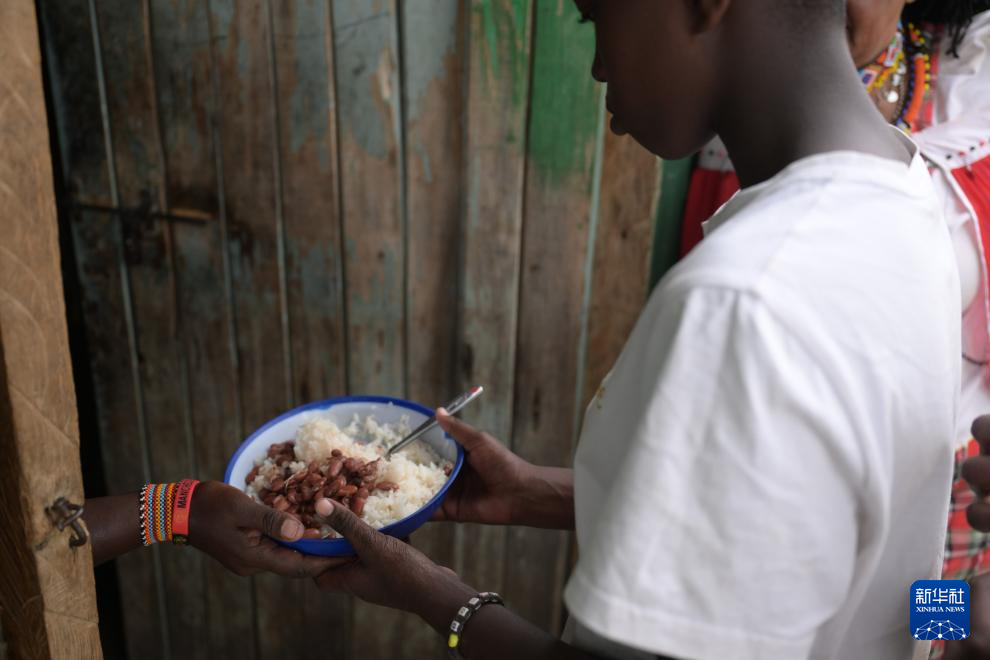 8月31日,在肯尼亚西南部纳罗克郡西纳罗克区艾通镇的女童救助中心,一名女孩从厨房领取午饭。新华社记者 杨光 摄