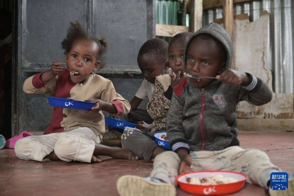 8月31日,在肯尼亚西南部纳罗克郡西纳罗克区艾通镇的女童救助中心,几名年龄较小的女孩在宿舍门口席地而坐吃午饭。新华社记者 杨光 摄