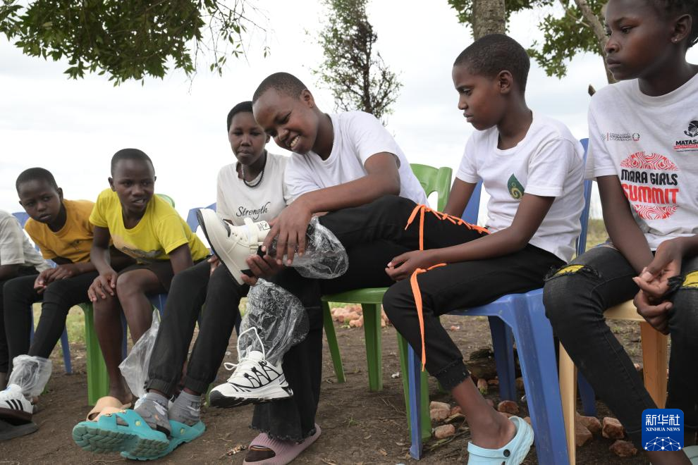 8月31日,在肯尼亚西南部纳罗克郡西纳罗克区艾通镇的女童救助中心,女孩们套了塑料袋试穿中国游客捐赠的鞋子。新华社记者 杨光 摄
