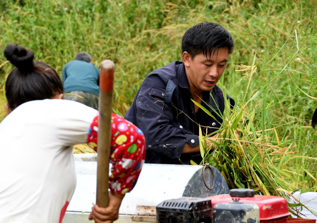 9月18日,在四川省宜宾市兴文县仙峰苗族乡兴隆村,村民正在收割水稻。(新华社记者高健钧摄)