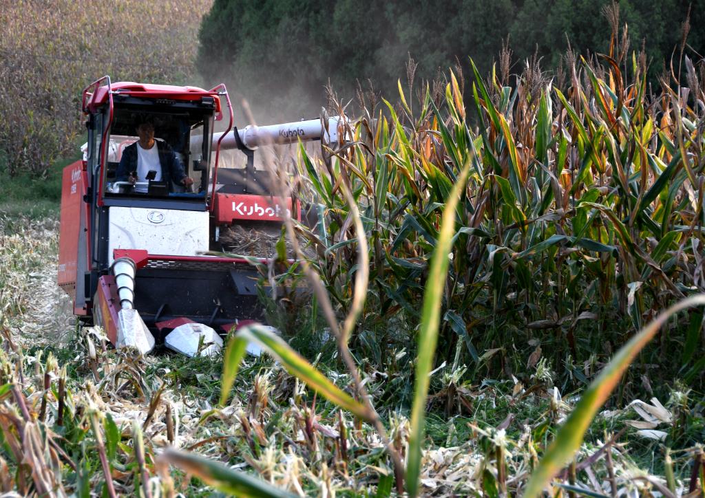 9月15日,在四川省三台县金石镇土城村,一台收割机正在收割玉米。(新华社记者高健钧摄)