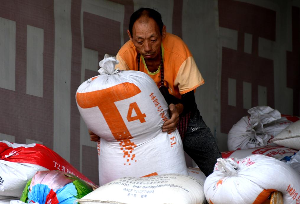 9月18日,在兴文县僰王山镇陈仁池企业的烘干设施旁,工人正在装卸烘干的水稻。(新华社记者高健钧摄)