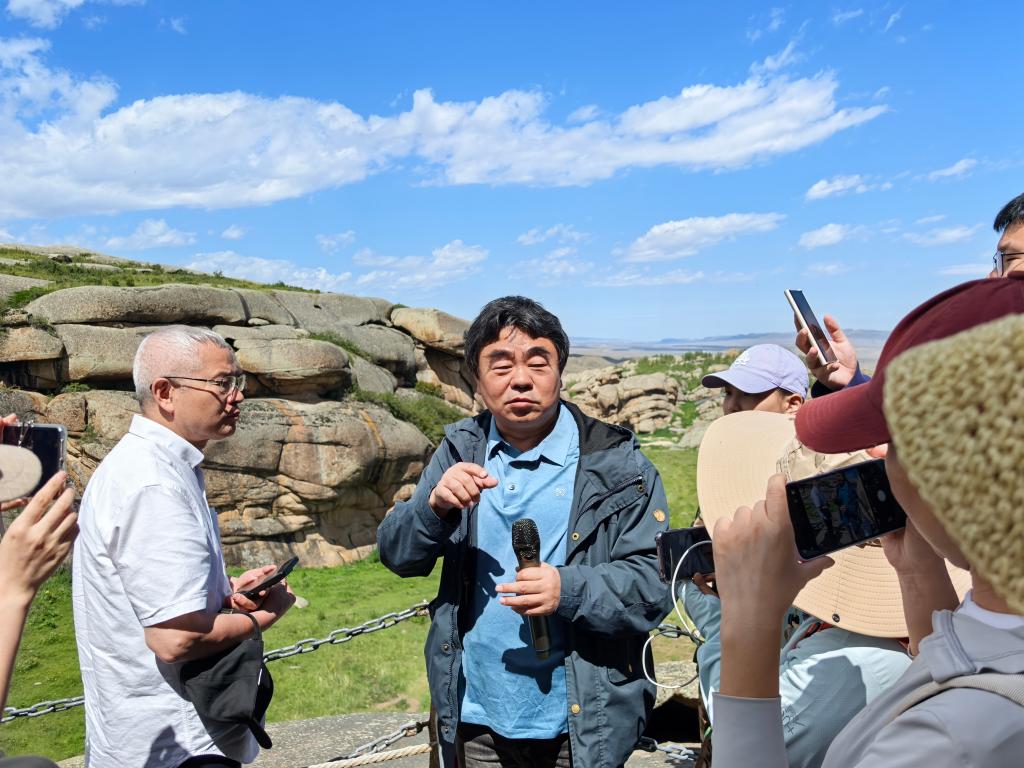 通天洞遗址考古工作队队长、新疆文物考古研究所研究员于建军为游客讲解考古发掘经历。新华社记者 张瑜 摄