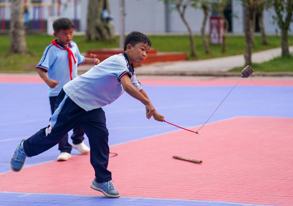 戈的小学的孩子们在打陀螺