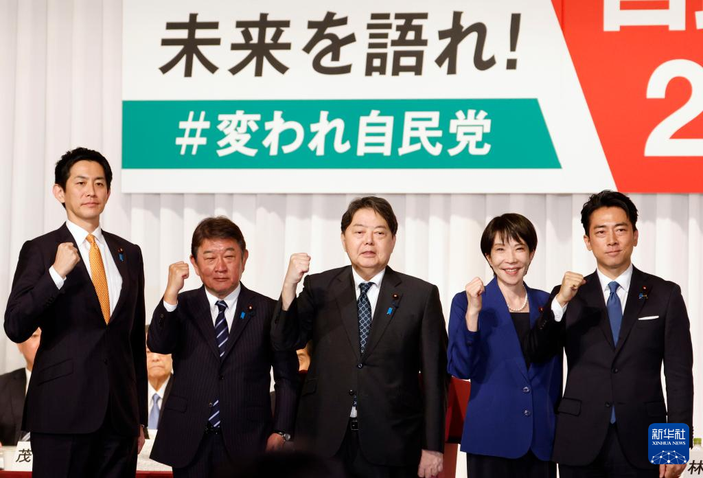 9月22日,在日本东京,日本自民党总裁选举候选人、前经济安全保障担当大臣小林鹰之、自民党前干事长茂木敏充、内阁官房长官林芳正、前经济安全保障担当大臣高市早苗、农林水产大臣小泉进次郎(从左至右)在自民党总裁选举政见发表演讲会上合影。新华社发(Pool图片,弗兰克·罗比雄摄)