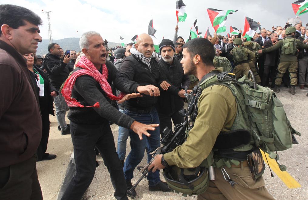 2020年1月29日,在约旦河西岸城市图巴斯东部的泰亚西尔检查站,巴勒斯坦示威者与以色列士兵对峙。新华社发(尼达尔·艾仕塔耶摄)
