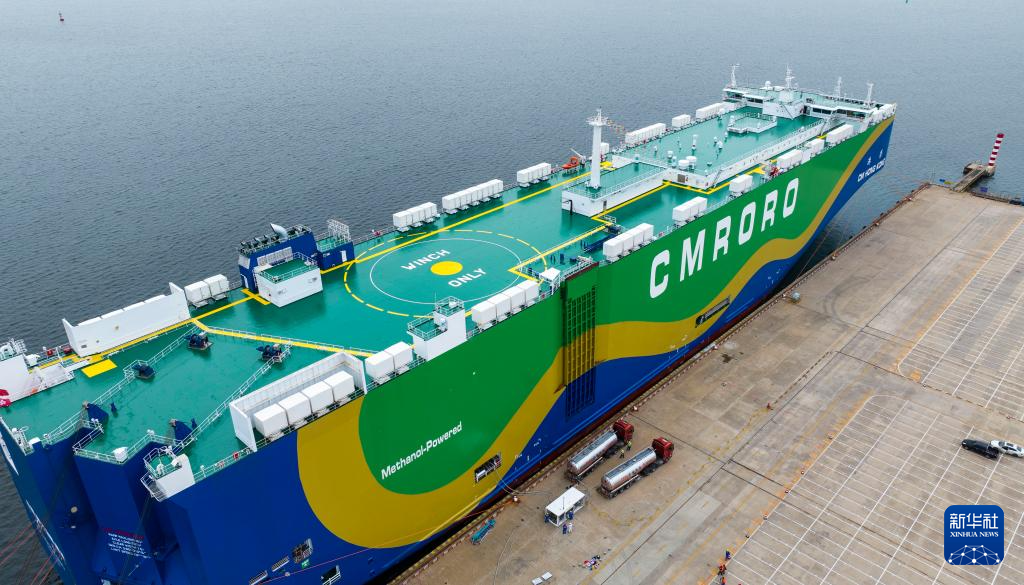 9月22日15时许,靠泊在天津港环球滚装码头的甲醇双燃料动力汽车滚装船“港荣”轮,开始300吨国产绿色甲醇岸基加注。这标志着天津港已具备规模化供应绿色甲醇能力。