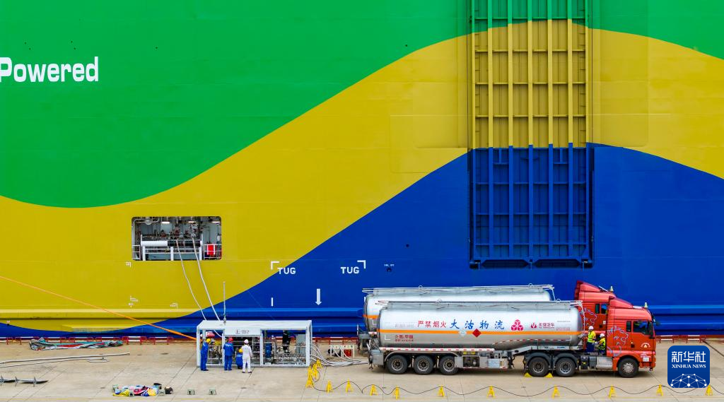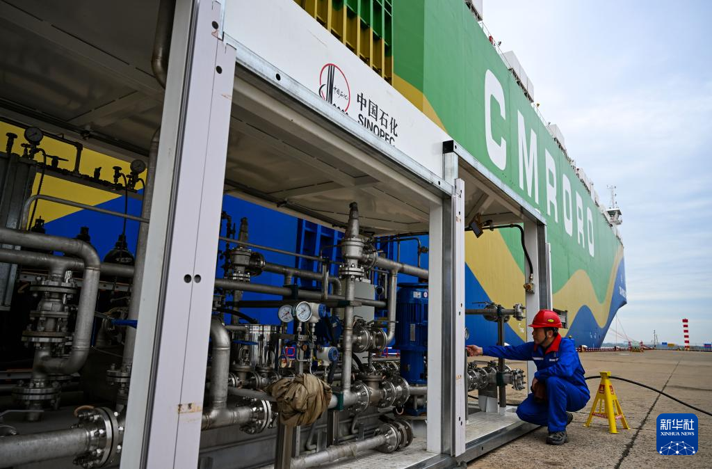 9月22日,在天津港环球滚装码头,工作人员准备进行甲醇加注作业。新华社记者 赵子硕 摄