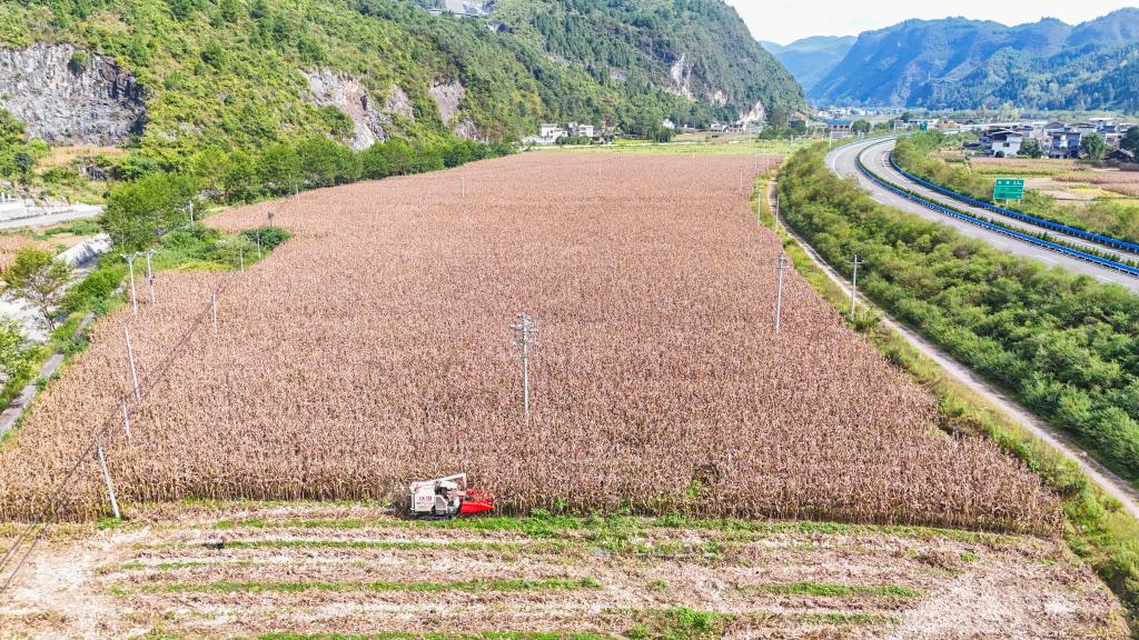 在贵州印江的广袤田野上,大豆玉米带状复合种植基地迎来丰收季。新华社发(王东 摄)
