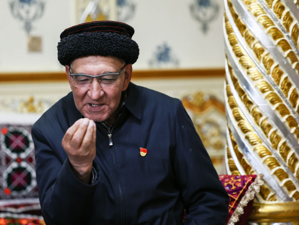 2023年9月4日,“时代楷模”拉齐尼·巴依卡的父亲巴依卡老人在新疆塔什库尔干塔吉克自治县的家中接受采访。生活于帕米尔高原上的塔吉克族儿女,素来心中怀有“家是塔县,国是中国,放牧守边是职责”的爱国守边精神。巴依卡老人一家三代70年接续守边护边,爱国奉献的壮举感动了无数国人。“边境线是中国的边境线,红其拉甫是中国56个民族的红其拉甫,我们的56个民族就要像石榴籽一样紧紧抱在一起。”巴依卡老人说。