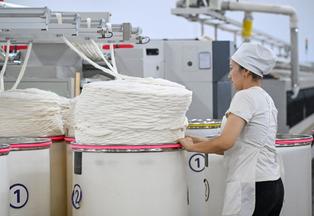 2024年7月4日,新疆克孜勒苏柯尔克孜自治州一家纺织企业的工人在纺纱车间工作。棉花和纺织服装产业已成为新疆重要的民生产业和支柱产业。近年来,克孜勒苏柯尔克孜自治州阿图什市以棉纺织业为引领,积极招商引资,打造集纺纱、织布以及高端纺织品研发为一体的大型纺织产业园区,为周边乡镇群众提供1500余个就业岗位。
