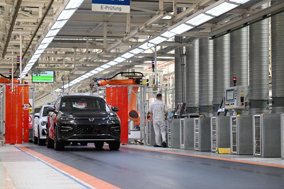 在天津经济技术开发区一汽—大众华北基地总装车间,新车有序下线。新华社记者赵子硕 摄