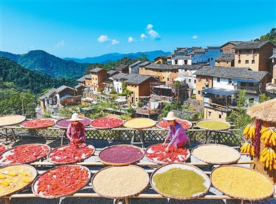 9月17日,在安徽省黄山市歙县深渡镇阳产村,村民在土楼前晾晒农作物。施亚磊摄(人民图片)