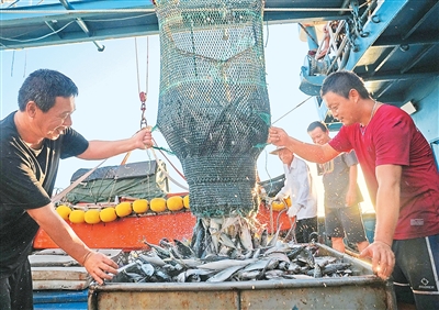 9月16日下午,捕捞归来的渔船满载渔获,停靠在浙江省玉环市大麦屿码头,渔民将大量海鲜分拣、保鲜运送,以最快速度投放市场。段俊利摄(人民视觉)