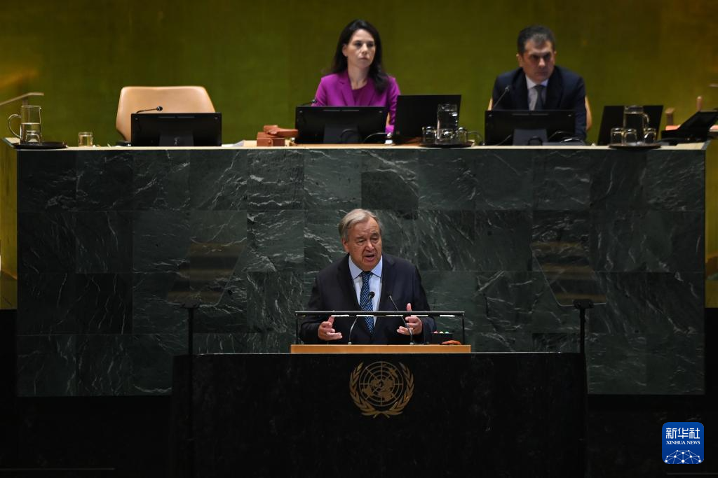 9月23日,在位于纽约的联合国总部,联合国秘书长古特雷斯在第80届联合国大会一般性辩论开幕式上致辞。新华社记者李睿摄