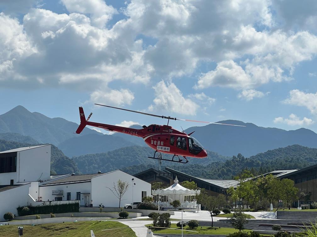 5月17日,游客乘坐直升机畅游黄山市黄山区悠悠湖文旅街区。新华社发