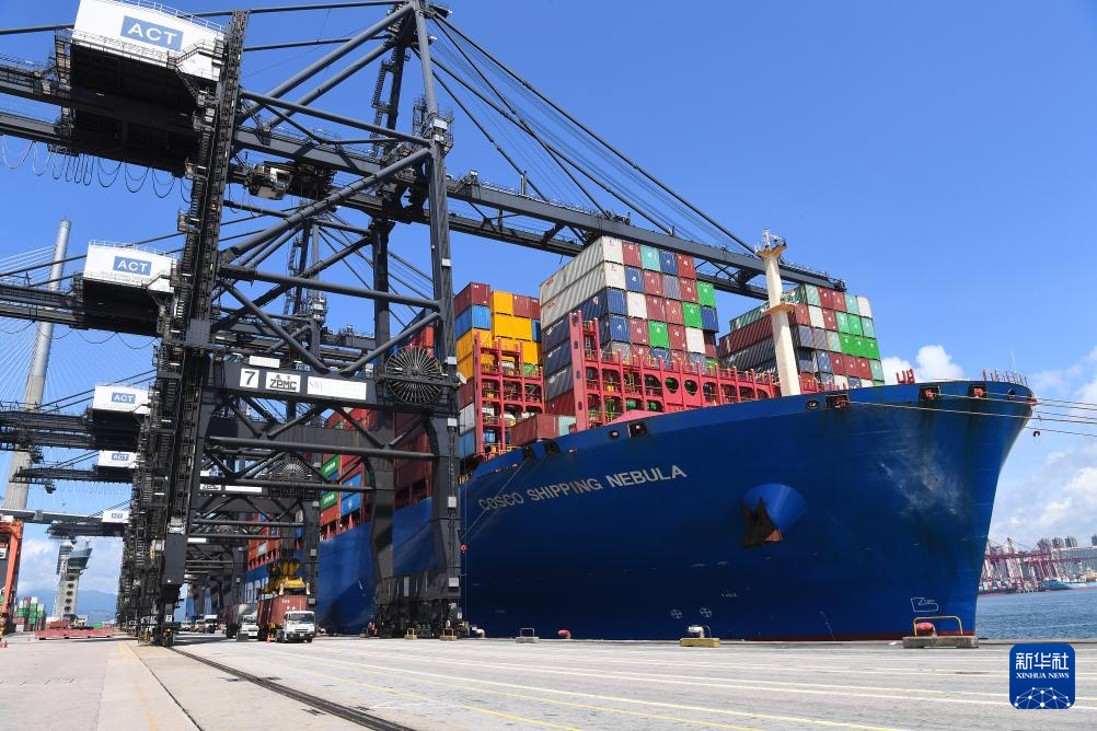 2025年5月22日,一艘集装箱货轮在香港货柜码头装货。新华社记者陈铎摄