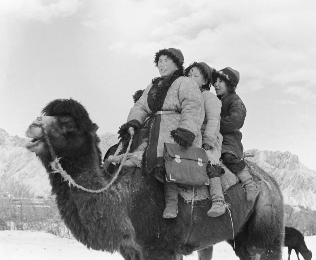 新疆乌恰县的牧民骑骆驼上学(1954年发)。