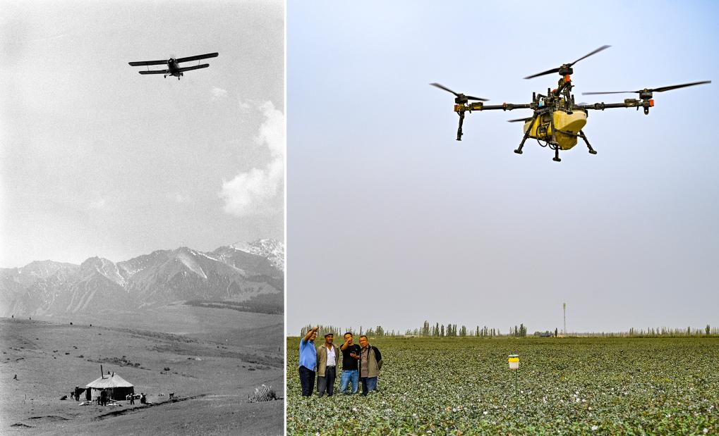 拼版照片,左图为新疆民航局飞机正在草原上撒播草种(1981年6月12日发,新华社记者 武纯展 摄);右图为2025年9月19日,极飞超级棉田负责人艾海鹏(右二)在尉犁县的示范棉田里为达西村村民进行智能无人机洒药培训。无人化智慧农场应用农业无人机、农业无人车、遥感无人机、农机自驾仪等系列物联设备实施“水肥一体化”管理,农民用一部手机即可操作智能设备完成多项田间管理工作。(新华社记者 陈朔 摄)