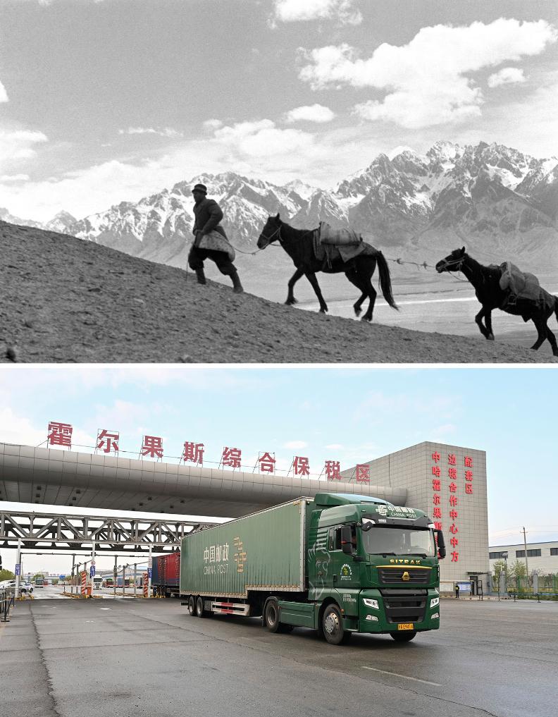 拼版照片:上图为1960年,新疆塔什库尔干塔吉克自治县邮递员艾再孜汗翻山越岭,把邮件投送到帕米尔高原上的各个角落(新华社记者 武纯展 摄);下图为2025年9月11日,一辆运送邮件的邮车正驶出霍尔果斯综合保税区。霍尔果斯国际邮件交换站于2022年7月正式运营,以进出口物流渠道为支持,为跨境电商产业链上下游提供仓储和快递物流综合解决方案。承运中国至中亚多国、俄罗斯以及欧洲国家的出口国际邮件。3年来,累计国际邮件交换量2026吨(新华社记者 李贺 摄)。