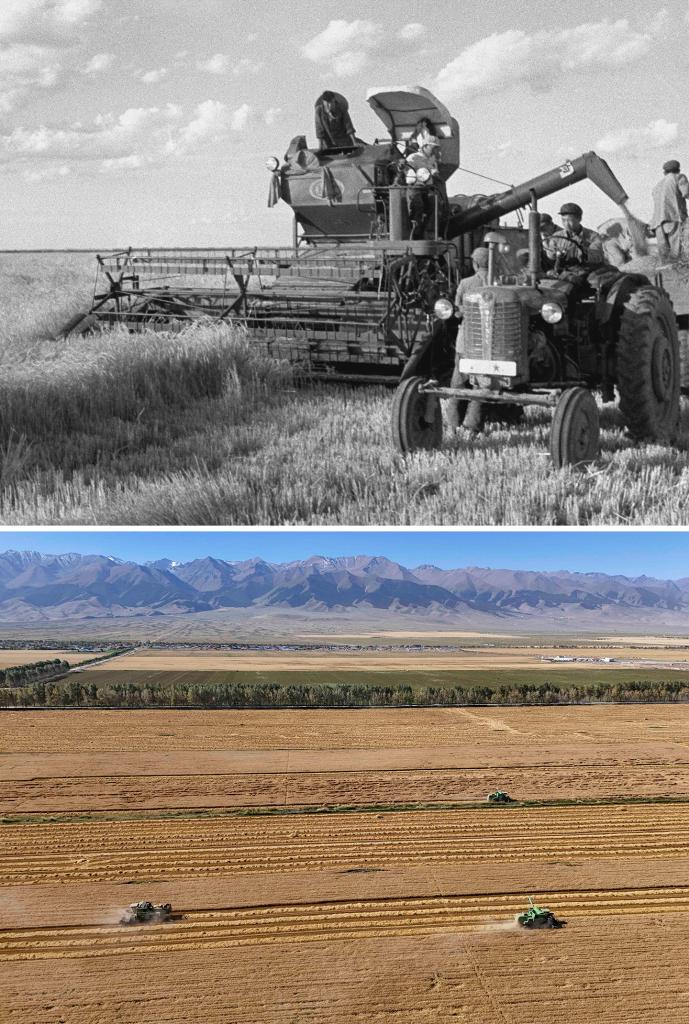 拼版照片,上图为20世纪60年代初,新疆莫索湾垦区收割小麦的场景。(新华社记者 武纯展 摄);下图为2024年9月7日,收割机在新疆生产建设兵团第十三师新星市红山农场收割小麦。(新华社记者 胡虎虎 摄)