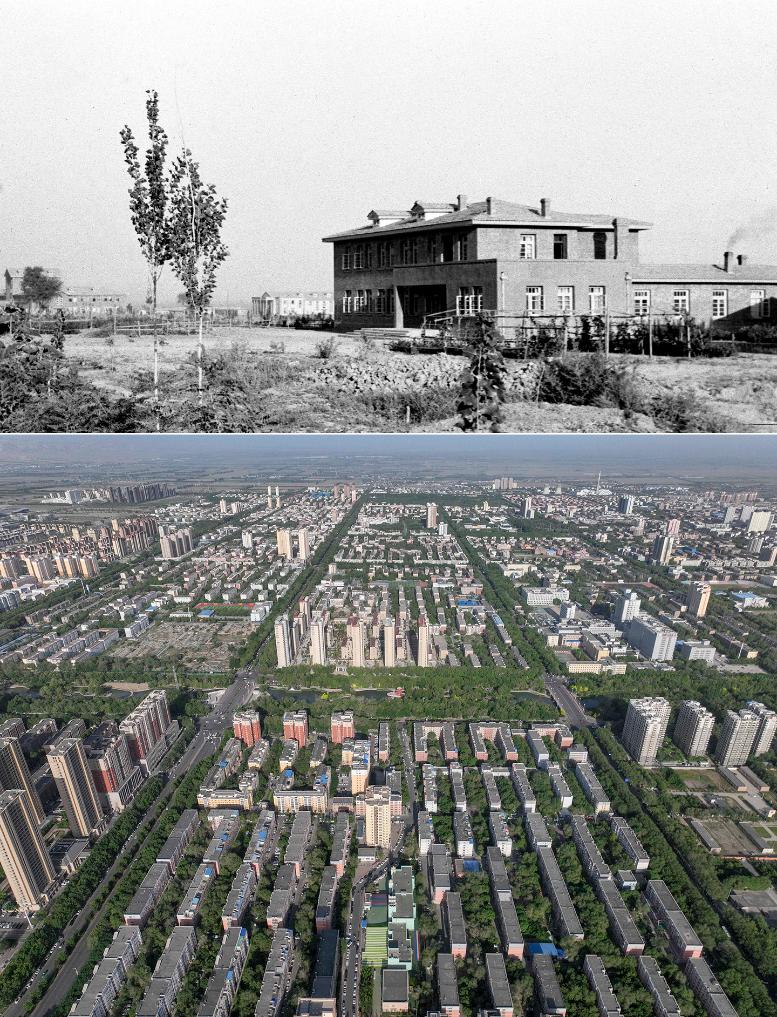 拼版照片:上图为建设中的石河子新城(1953年9月发,新华社记者 武纯展 摄);下图为2024年5月15日拍摄的石河子市城区(新华社记者 胡虎虎 摄)。