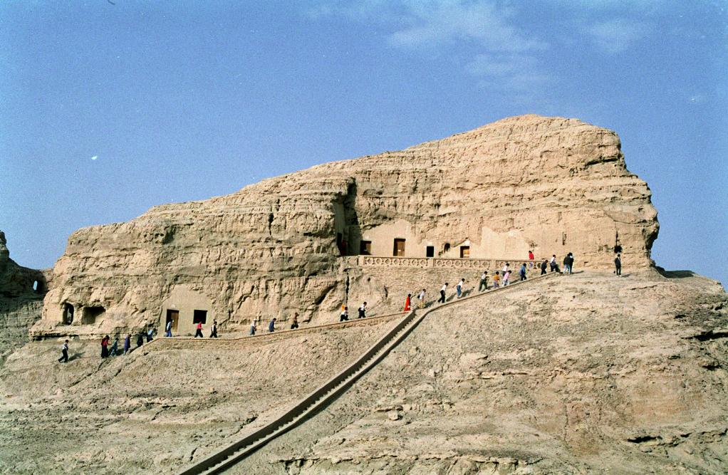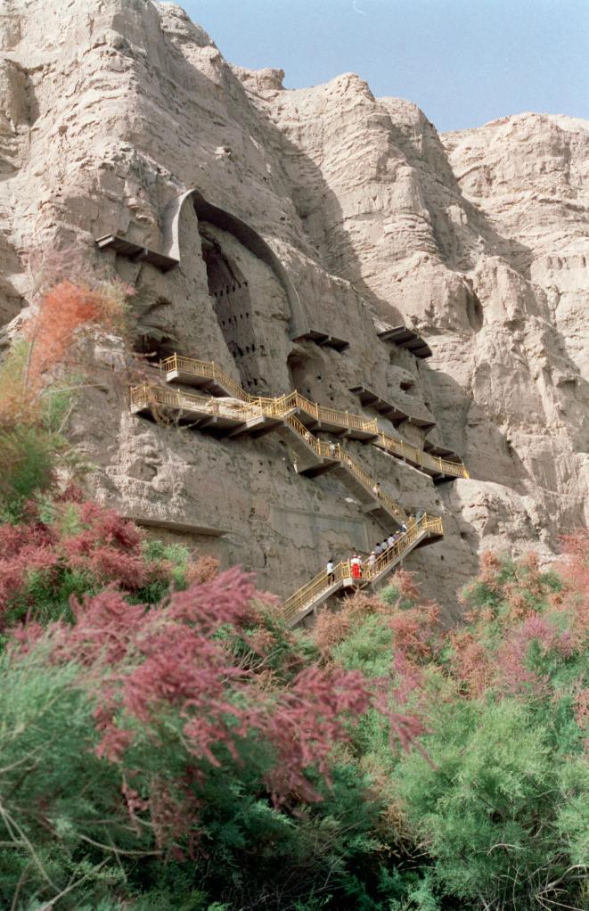 游客在克孜尔千佛洞参观(1994年12月6日发)。