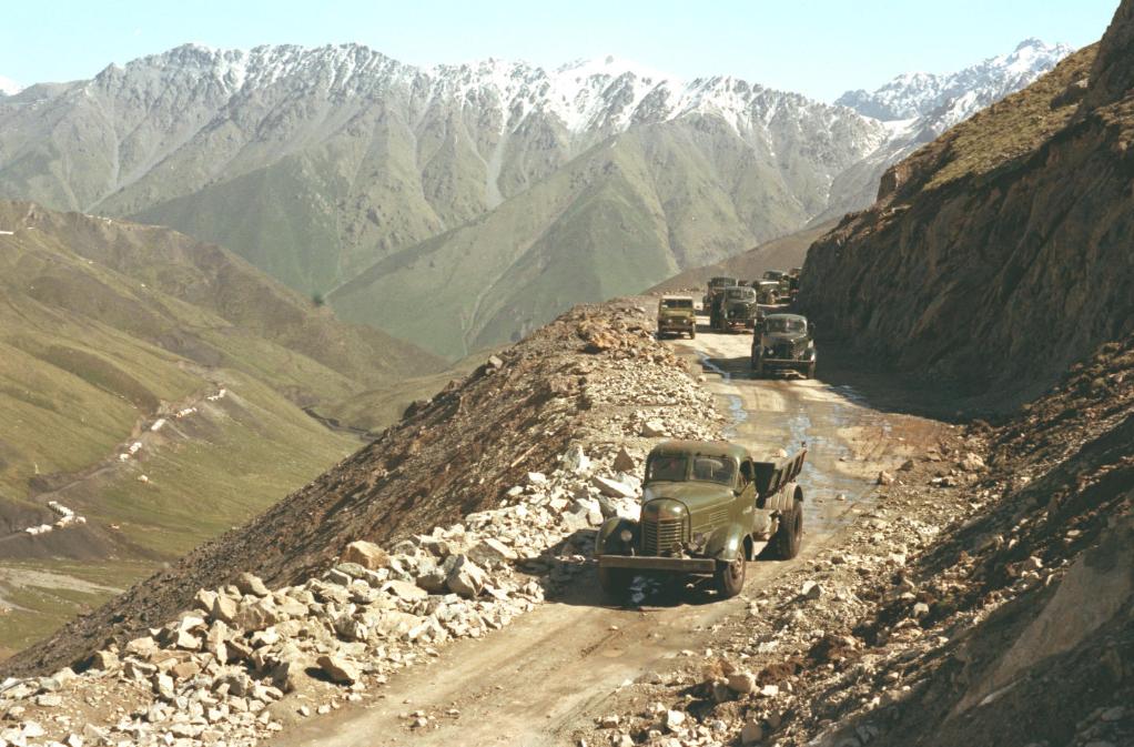 天山公路全线路基工程已经完工。天山公路(又称独库公路),从天山北麓的“石油之城”独山子,穿过海拔3000多米的崇山峻岭到达新疆南部库车,全长532公里,是沟通新疆南北的交通动脉。(1980年8月18日发)