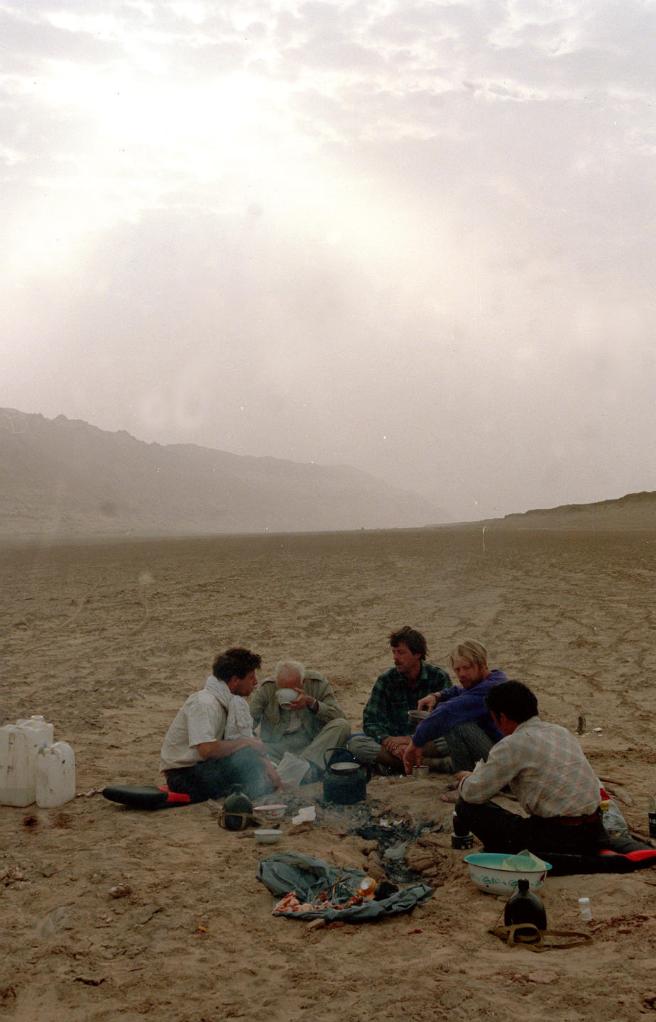 1988年9月,一支中法联合科学考察队对新疆南部和田地区的沙漠绿洲进行了为期52天的考察。这是中法联合科考队人员在新疆塔克拉玛干沙漠麻扎塔格一带风餐露宿。